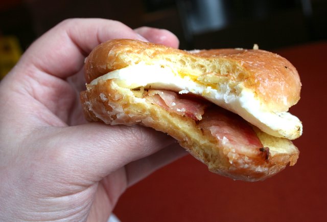 continuing in the rich tradition of savory/sweet fast food breakfast creations like the mcgriddle and taco bell's waffle taco , dunkin' donuts has gotten into the game with a glazed donut breakfast.